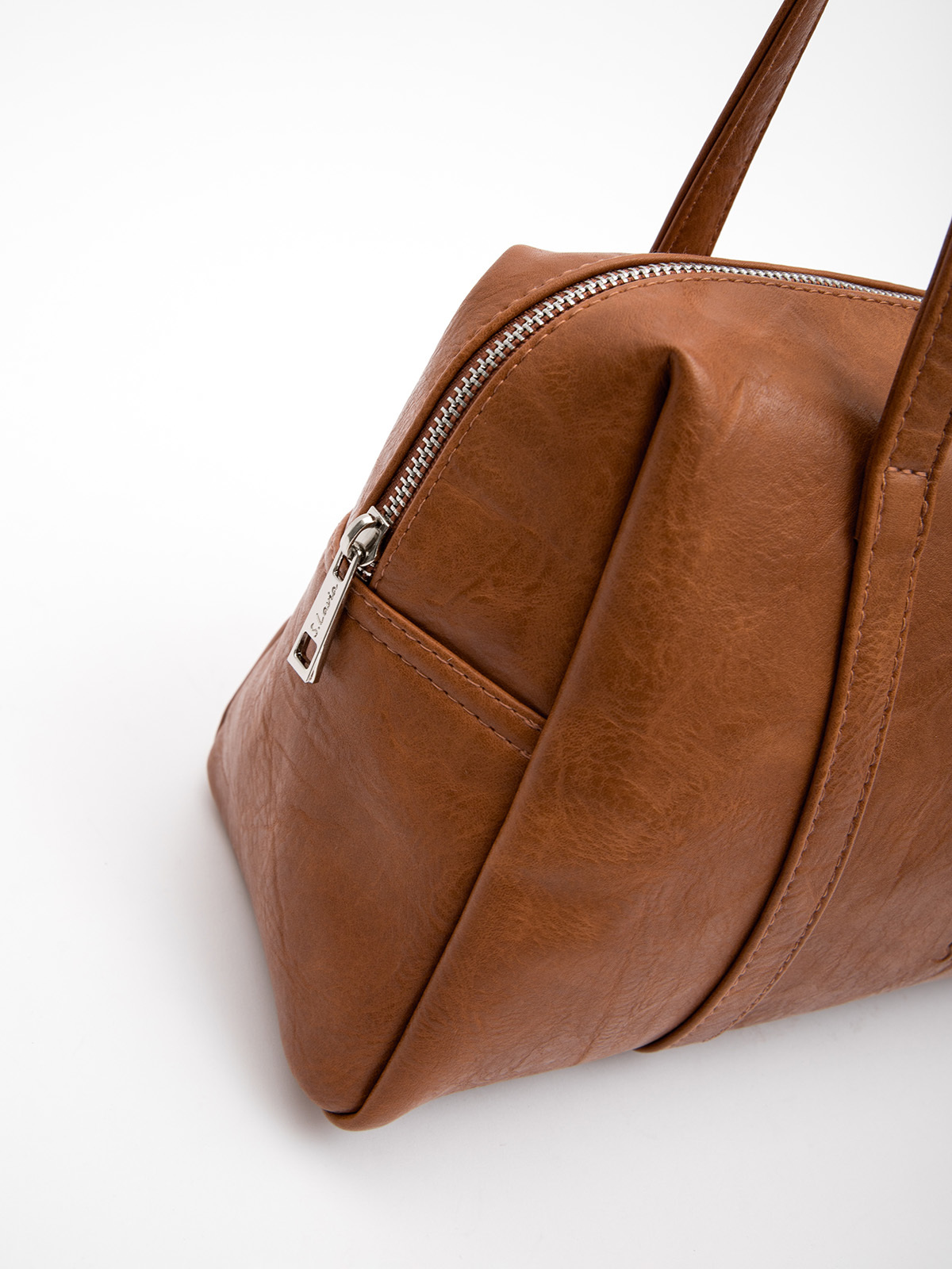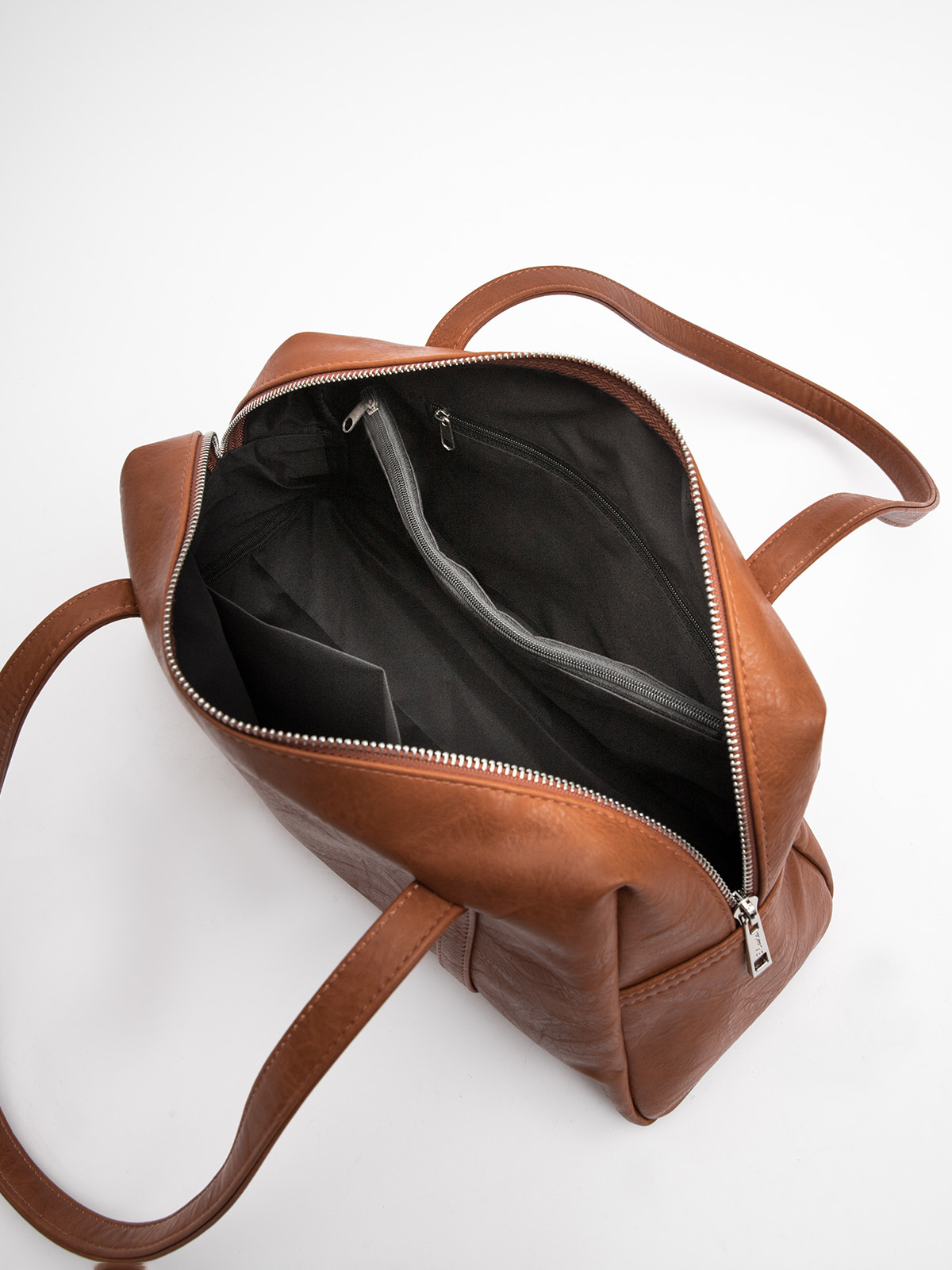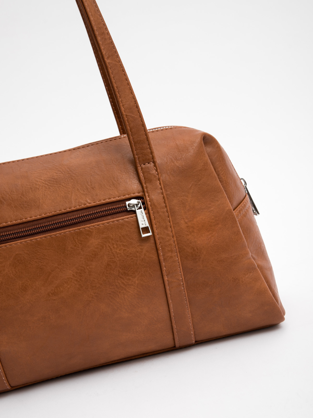Эта женская сумка-саквояж габарита M с центральным входом на металлической молнии сочетает в себе винтажный шарм и современную практичность. Плоские настрочные ручки на передней и задней части дополнены тиснением на лицевой стороне и удобным карманом на молнии сзади. Внутри аккуратная окантовка, два стандартных кармана и дополнительный накладной карман на молнии для мелочей. Элегантный дизайн и продуманная функциональность делают эту сумку стильным аксессуаром на каждый день.