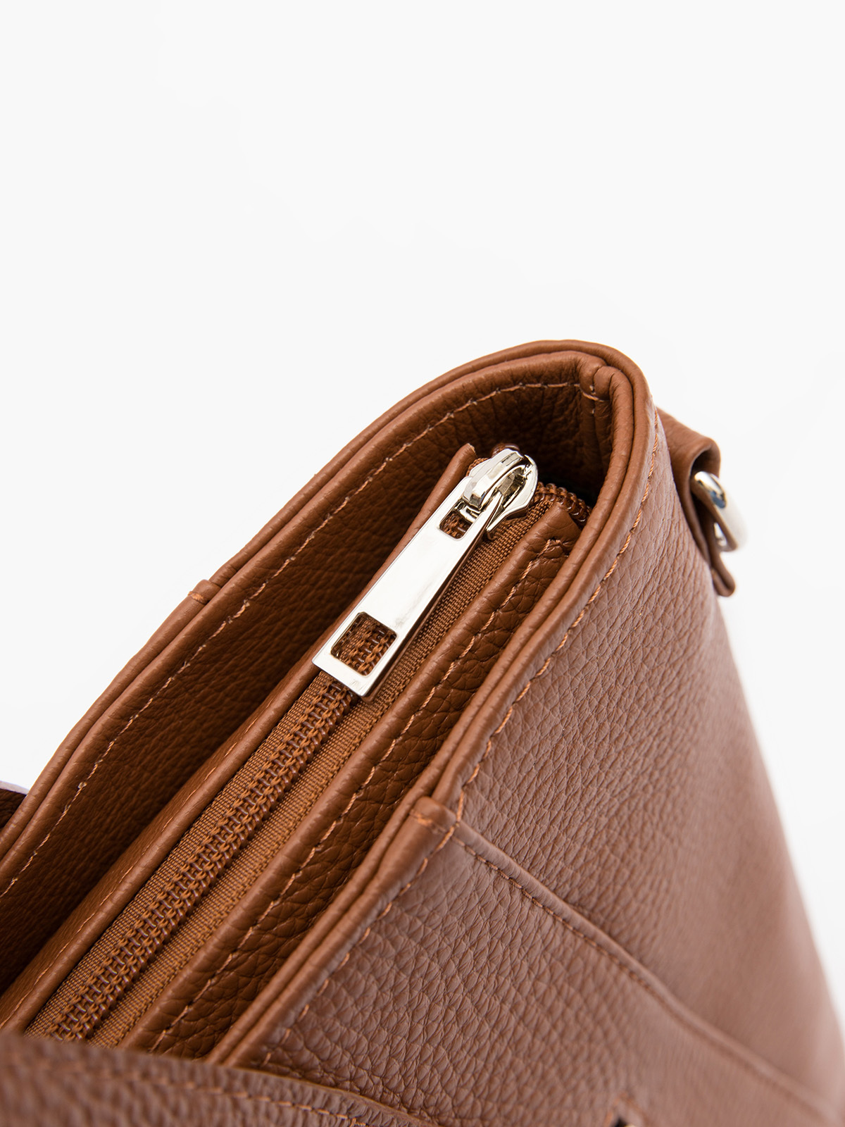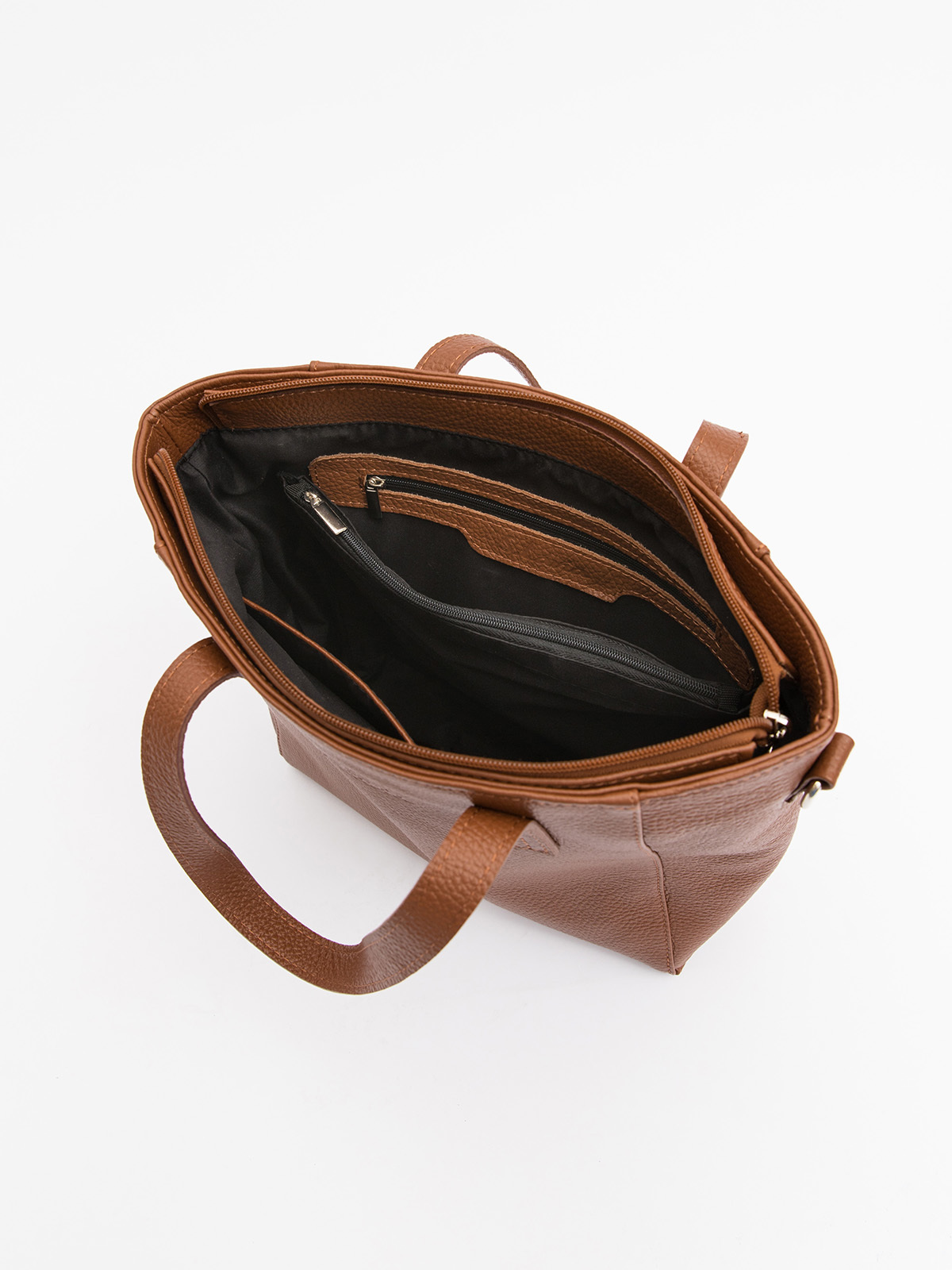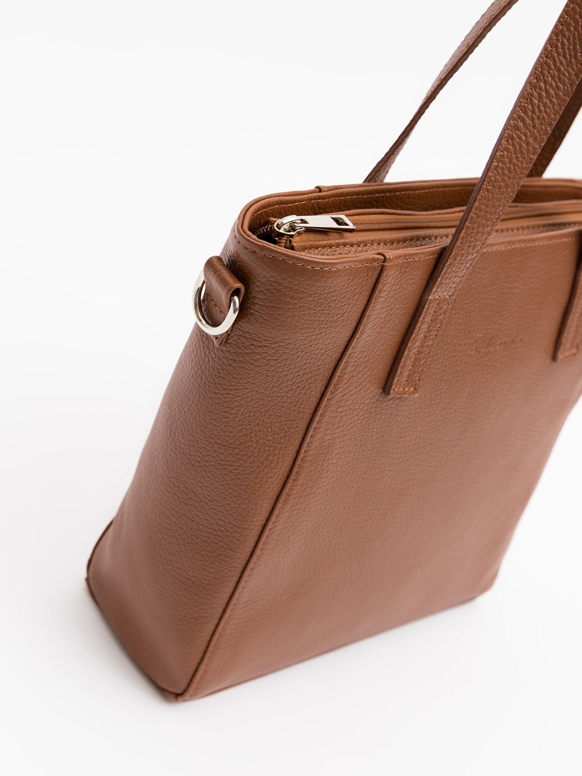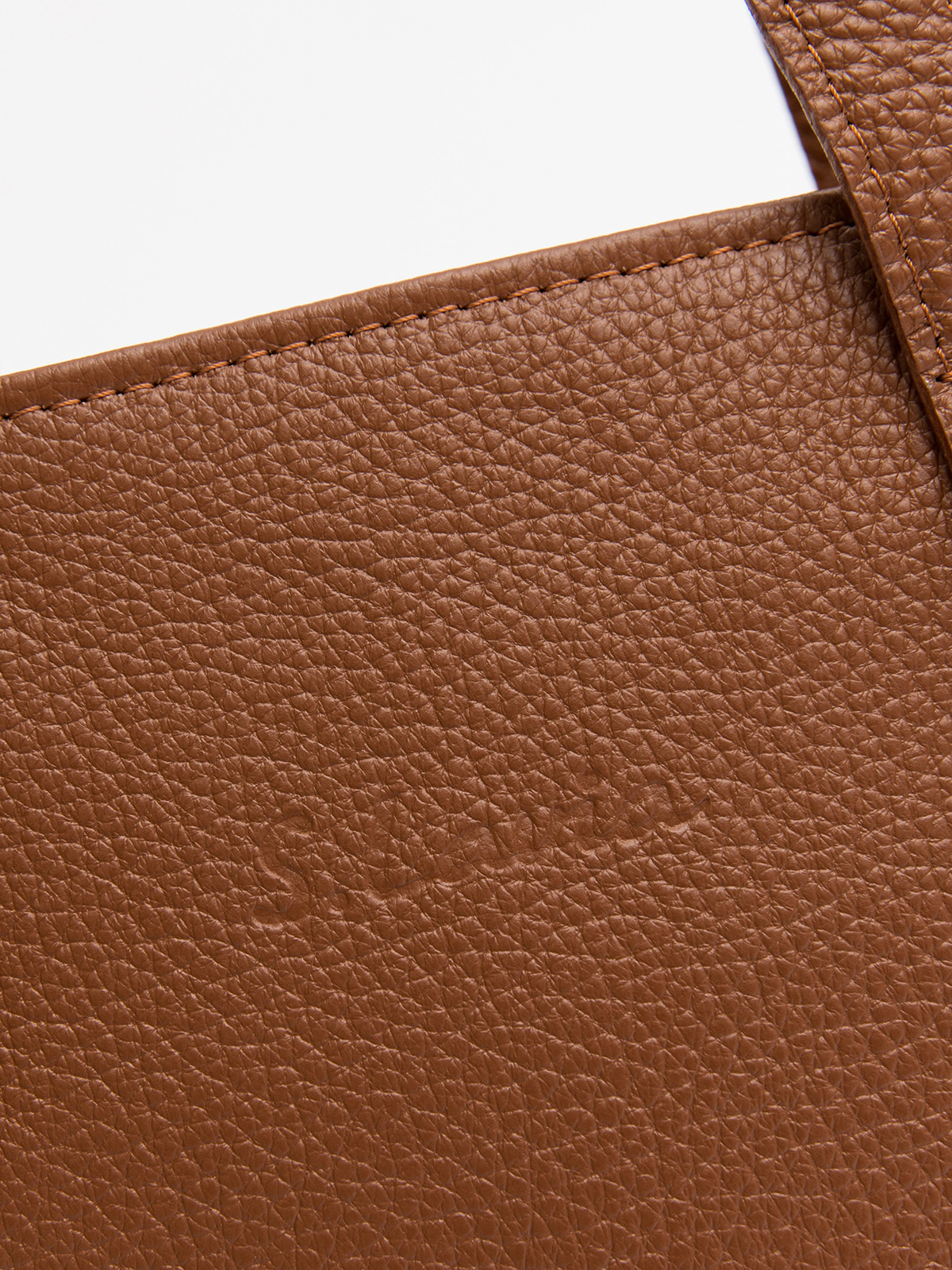 Элегантный кожаный тоут среднего размера с трапециевидным силуэтом, сужающимся книзу. Длинные настрочные ручки и съемный регулируемый ремень на карабинах предлагают несколько вариантов ношения. Внутри - три стандартных кармана для удобного хранения мелочей. Задний карман на молнии обеспечивает быстрый доступ к необходимым вещам. Стильное тиснение на передней части завершает лаконичный классический дизайн сумки.