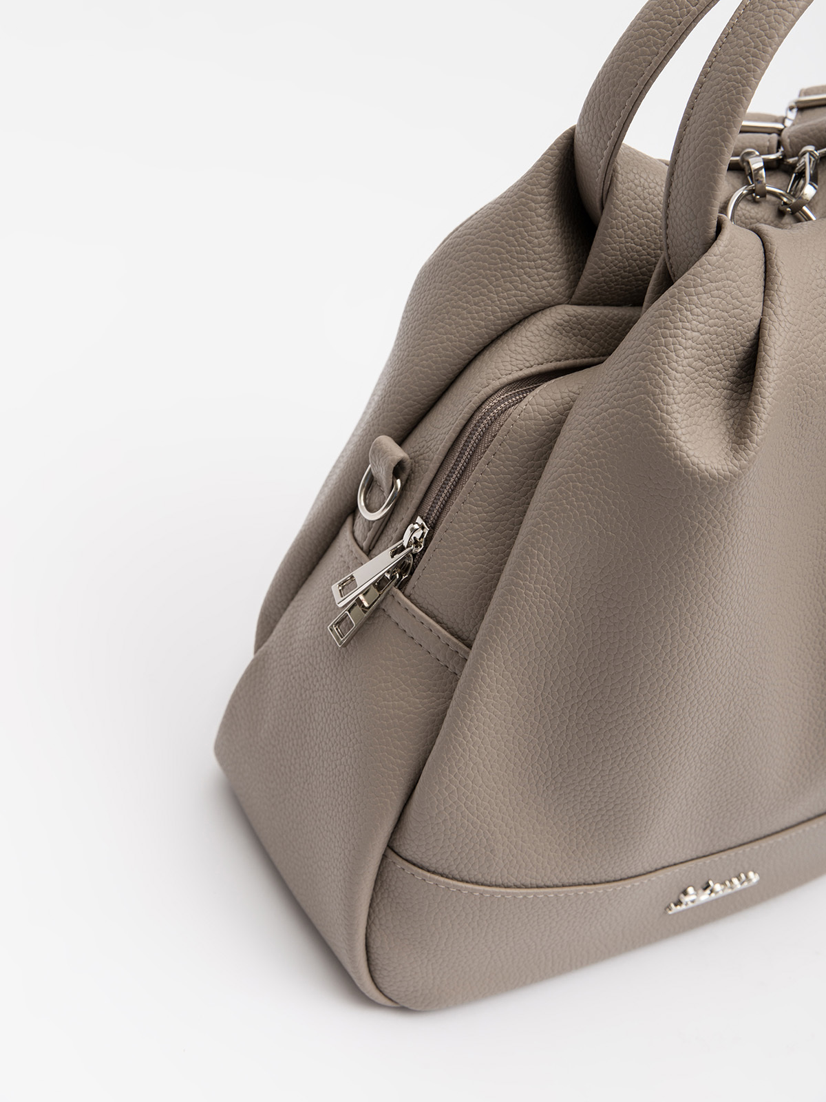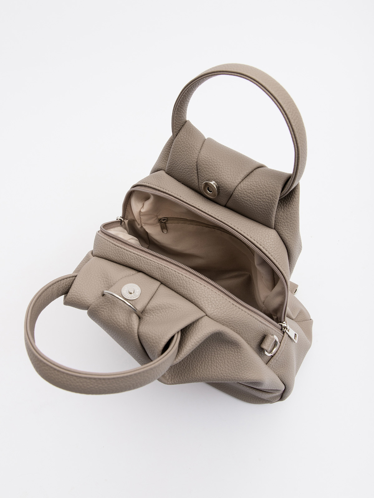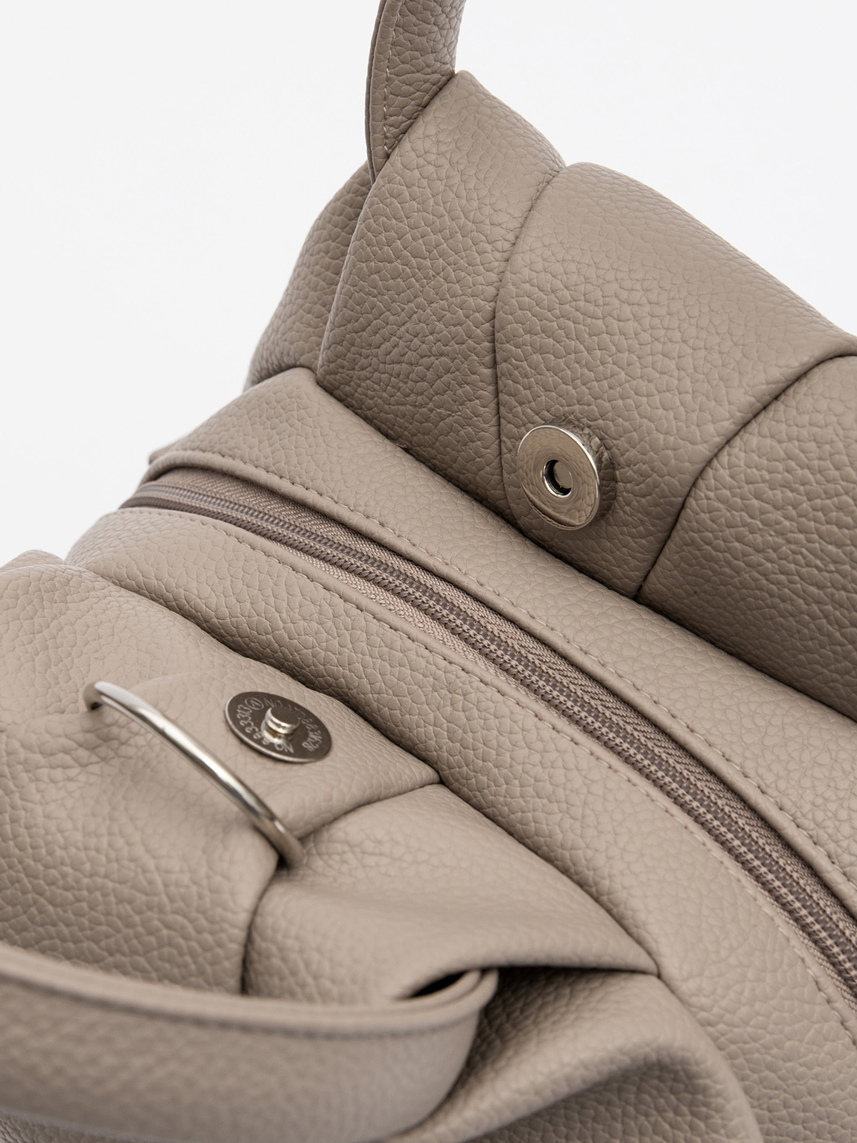 Женская сумка-рюкзак трансформер — универсальный аксессуар среднего размера для повседневного использования. Оснащена двумя круглыми ручками, её удобно носить в руке как сумку, а при необходимости — использовать как рюкзак благодаря съёмным регулируемым лямкам. Модель имеет одно вместительное отделение, внутренний и задний карманы для организации необходимых мелочей. Практичный дизайн сочетается с элегантностью и подходит для любого образа.
