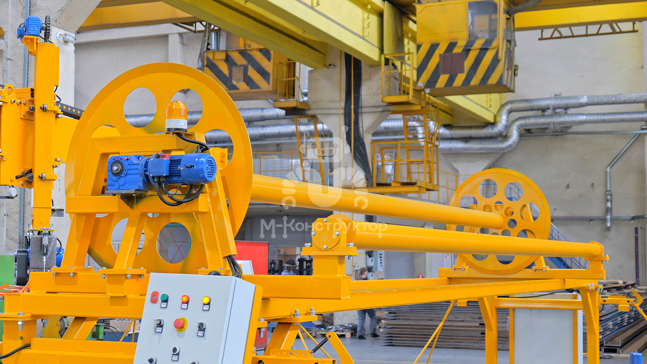 Размотчик перемещается по рельсам вдоль линии, разматывая полотно с барабана