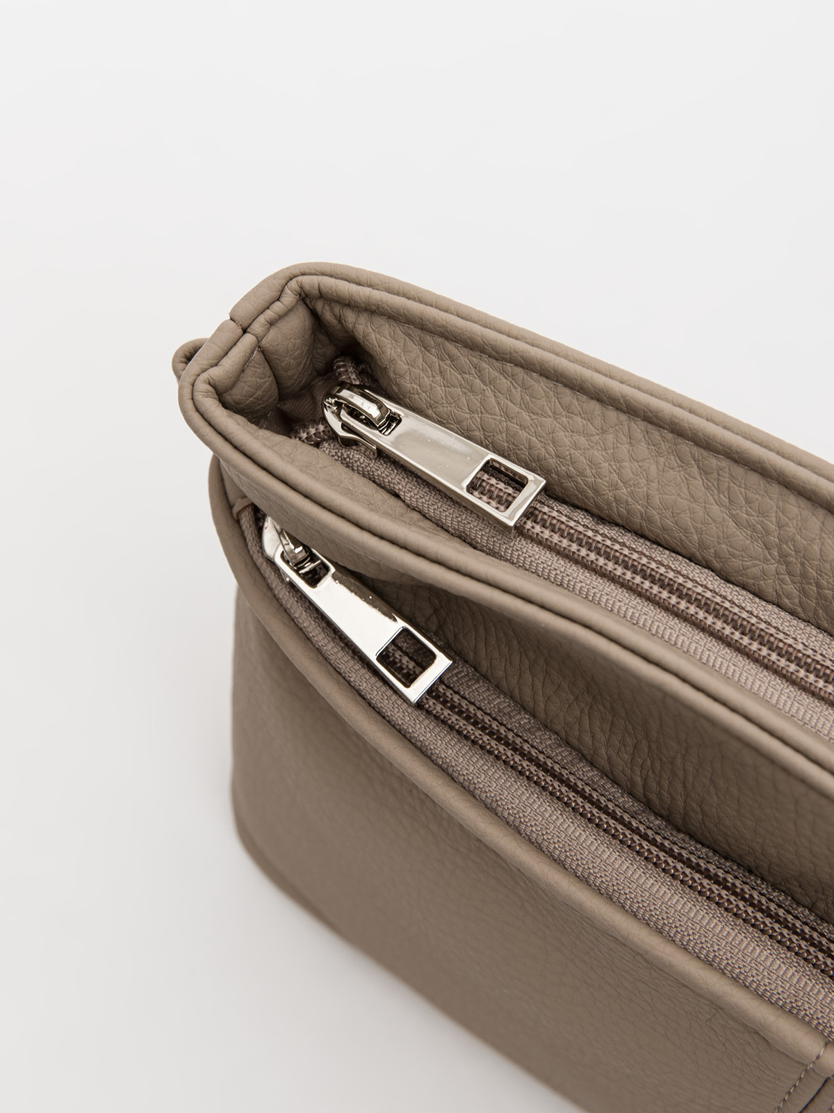 Доступна в однотонном исполнении для лаконичных луков и в комбинации трёх цветов для смелых сочетаний. Плоский силуэт без объёмного бочка позволяет носить её как клатч, а регулируемый ремень — на плече или через плечо. Множество карманов (основной отдел + передний карман + задний карман на молнии) обеспечивает идеальный порядок. Внутри — дополнительный карман на молнии и отделение для телефона. Компактная, но вместительная — идеальный баланс стиля и функциональности.