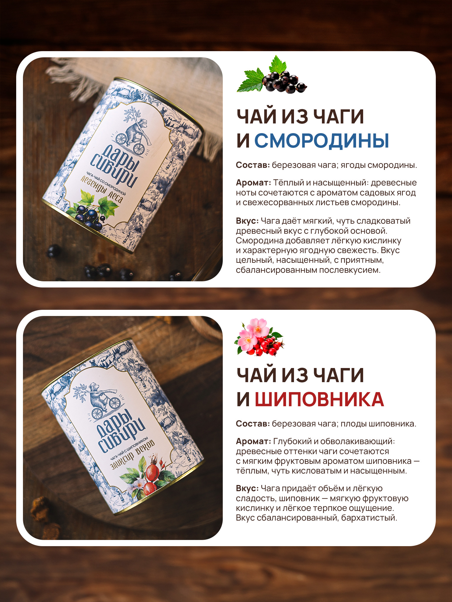 Набор "Двойная Защита" — объединяет в себе мощные свойства чаги с витаминами смородины и шиповника. Оба напитка обеспечивают организму поддержку иммунитета и заряд витаминов, помогая оставаться в тонусе и справляться с простудами.