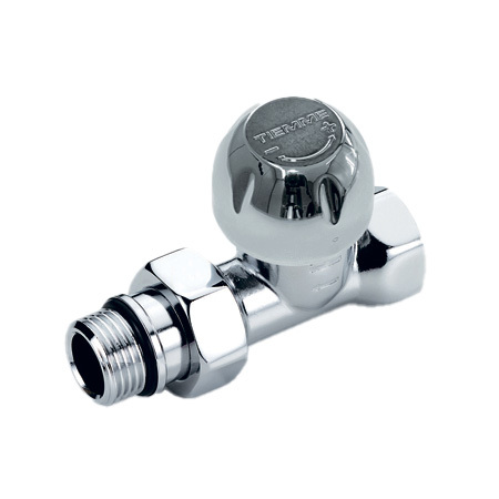 Прямой вентиль с термостатической опцией, с соединением для железных труб. Глянцевый хромированный.