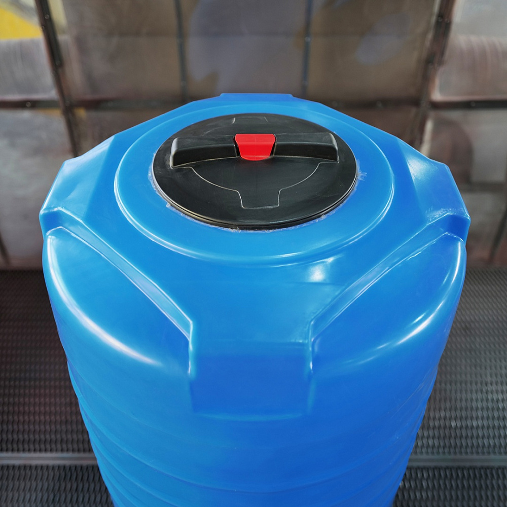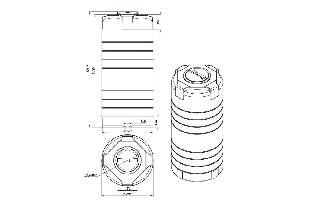 Вертикальная цилиндрическая бочка объемом 750 литров имеет максимально устойчивую конструкцию и усилена специальными горизонтальными ребрами жесткости.