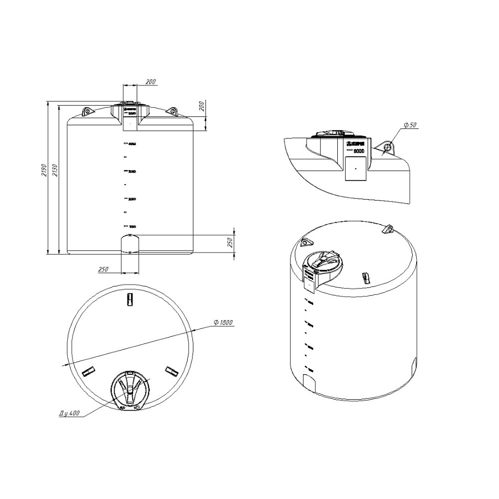 - мерная шкала на корпусе с шагом 500л для отслеживания уровня наполнения;