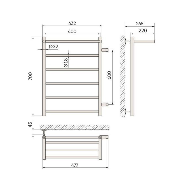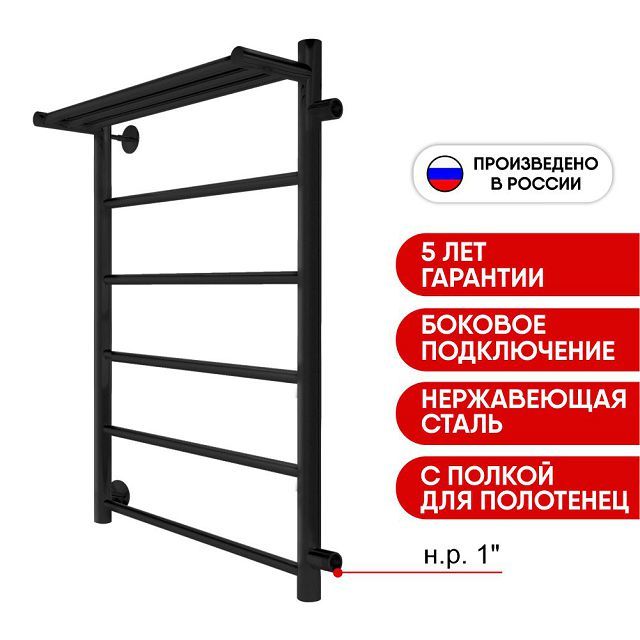Стильный водяной полотенцесушитель ''Indigo Line'' вида ''лесенка'' с прямыми перекладинами и дополнительной полочкой в стильном цвете ''Черный Муар''. Высота изделия 70 см, ширина - 40 см, боковое подключение справа, межосевое расстояние - 60 см. Изготовлен из стали марки AISI 304 с применением электроплазменной полировки методом аргонно-дуговой сварки согласно стандартам EN/ISO. Для подключения могут понадобиться фитинги. Уточните данную информацию у мастера подключения. Рекомендуем дополнительно приобрести комплект фитингов диаметром 1'', 1/2, или 3/4.