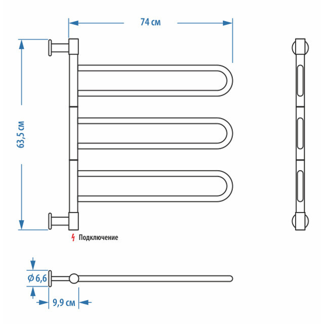 Электрический полотенцесушитель с тремя U-образными поворотными греющими секциями низкого энергопотребления - 18 Вт на секцию. Изготовлен из высококачественной пищевой нержавеющей стали. Предназначен для просушки вещей из ткани и дополнительного обогрева небольших помещений - душевых, ванных комнат и санузлов. Нагревательный элемент прибора - греющий кабель в изоляции из кремнийсодержащей резины. Может быть подключен как скрытым, так и наружным способом. Подключение производится через нижнюю стойку. Оснащён влагозащищенным выключателем с индикатором работы. Полотенцесушитель U G3 хром мощностью 54 Вт экономичен в эксплуатации и сопоставим по энергозатратам с электрической лампочкой. Нагрев до рабочей температуры за 5-10 минут. Имеет II класс электрической защиты и степень защиты от влаги IP 44, не нуждается в заземлении и подходит для установки в помещениях с повышенной влажностью.