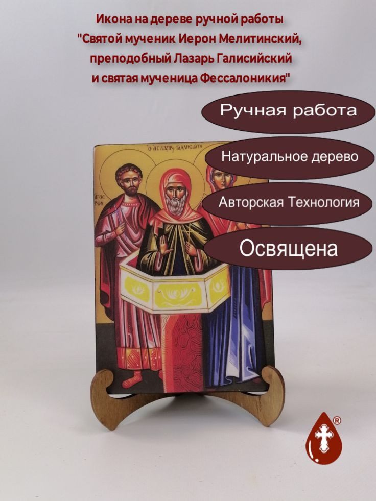 Икона на дереве "Святой мученик Иерон Мелитинский, преподобный Лазарь Галисийский и святая мученица Фессалоникия Амфипольская, 14x20x3 см, арт А263" станет прекрасным подарком для верующего человека, а также займет особое место в любом доме, храме или церкви.