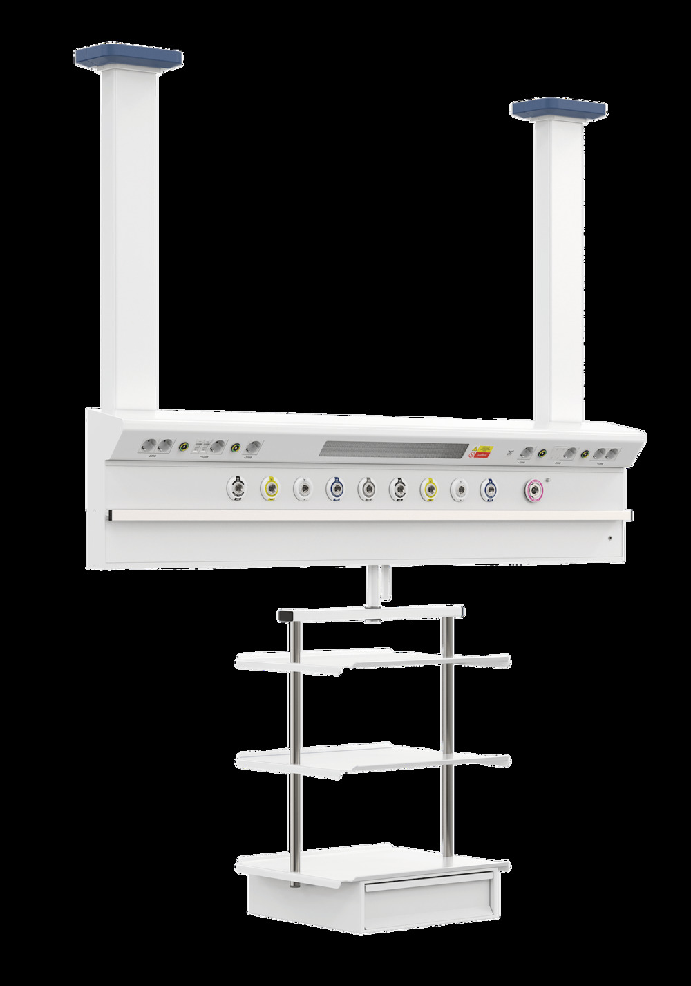 При необходимости на вертикальных опорах могут быть закреплены вращающиеся поворотные механизмы с профилем для крепления полок. Потолочная медицинская консоль CADUCEUS (Кадуцей) – идеальное решение для палат экстренной помощи и палат интенсивной терапии. Подвесная система комплектуется слаботочными розетками для передачи данных, электрическими розетками и разъемами быстрого соединения медицинских газов и вакуума, что позволяет оперативно соединиться с газовой магистралью и подключить необходимые аппараты за счет универсальной совместимости газовых разъемов со всеми видами медицинского оборудования. В комплектацию данной консоли входят разъемы заземления, которые используются для подключения медицинских электроприборов к линии заземления (технологического и функционального). Для удобства пациентов и персонала медицинского учреждения консоль оснащена светильниками прямого, непрямого освещения в горизонтальном шкафу и ночного освещения в нижней части вертикального профиля. Для обеспечения возможности крепления навесного оборудования CADUCEUS (Кадуцей) CBN2 комплектуется штангами и рельсами.