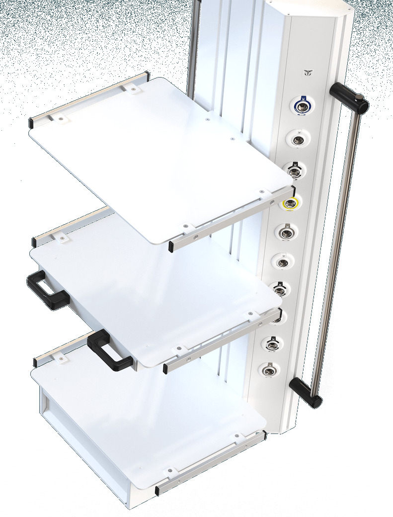 Для удобства медицинского персонала, газовые клапаны стандарта DIN 13260-2 размещены с одной стороны корпуса, а электрические и слаботочные розетки – с другой. Наличие центральной подвижной площадки позволяет устанавливать индивидуальное крепление анестезиологического аппарата, а для удобного размещения вспомогательного медицинского оборудования на шкафу можно расположить от 1 до 4 полок различных модификаций, при этом полки могут оснащаться медицинскими рельсами или выдвижными ящиками.